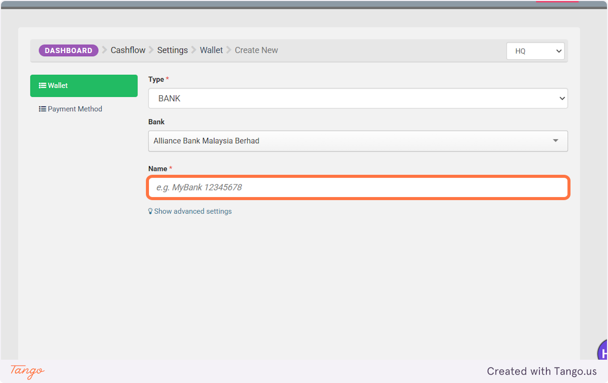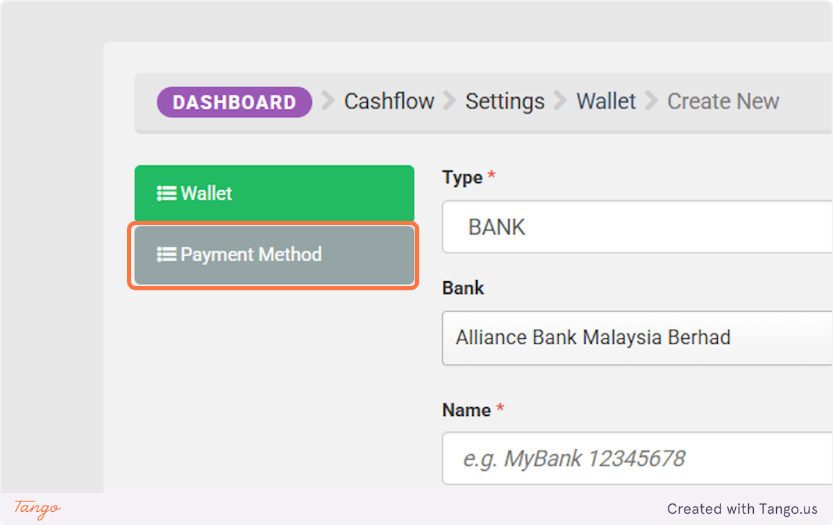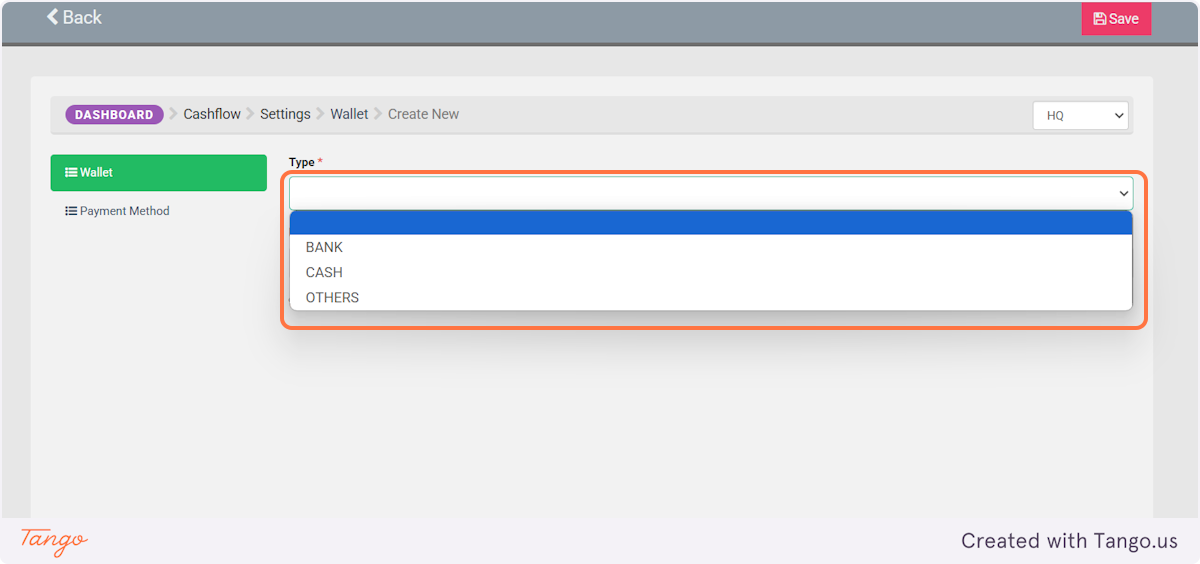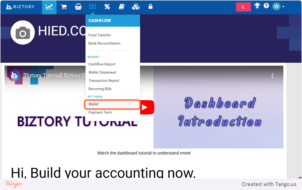 1. Click on Cashflow and select "Wallet"