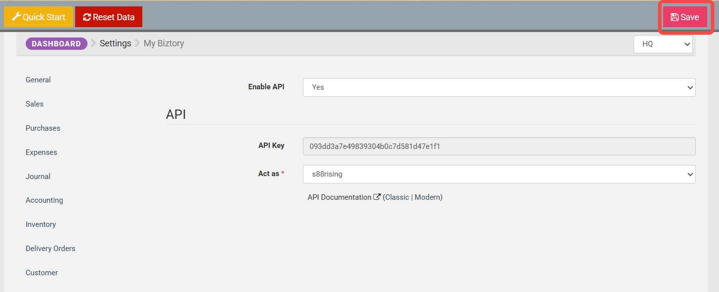 3. Choose a default user for Act as from the dropdown and copy the API key that you needed.