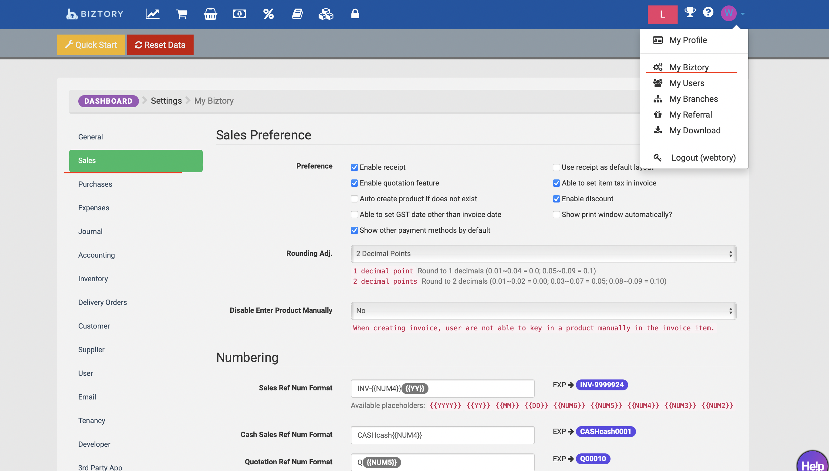 Please go to My Biztory -> Sales to update Ref number.