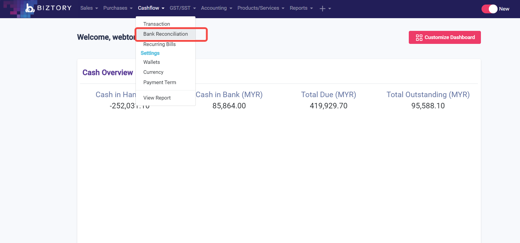 Select Bank Reconciliation: Click on "Bank Reconciliation.