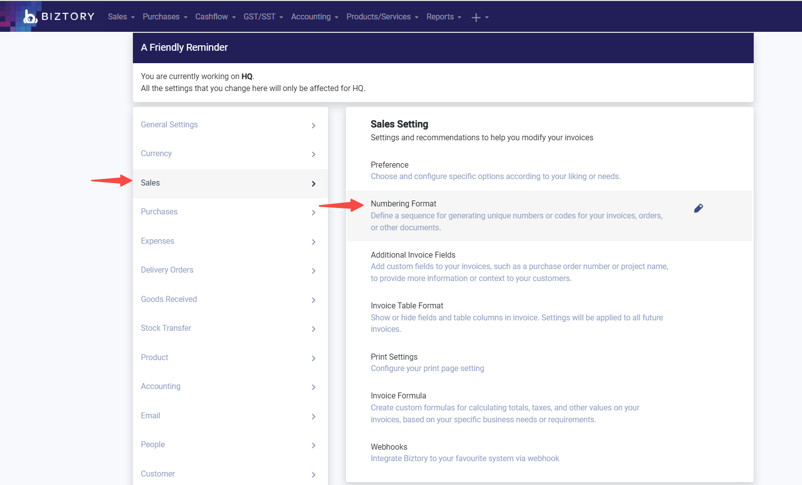 2. Select "Sales" and click on "Numbering Format"