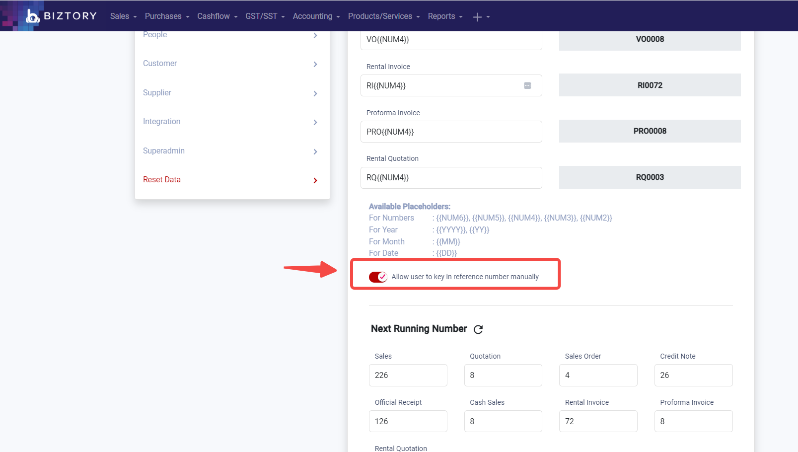 To enable manual entry of invoice numbers in Biztory, follow these steps below :