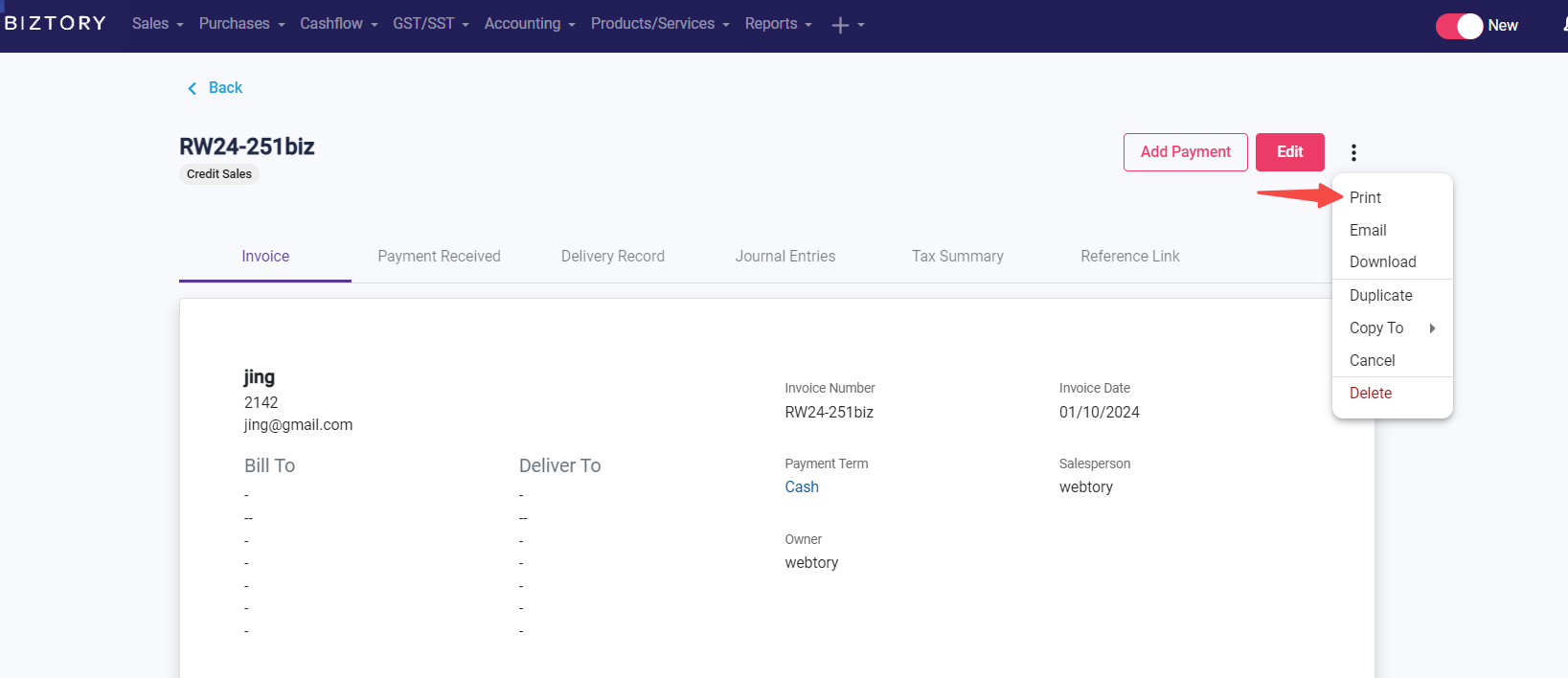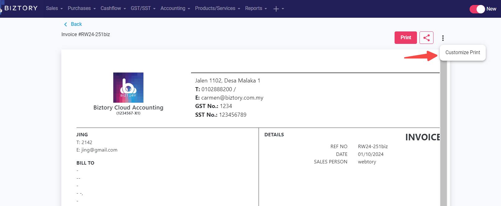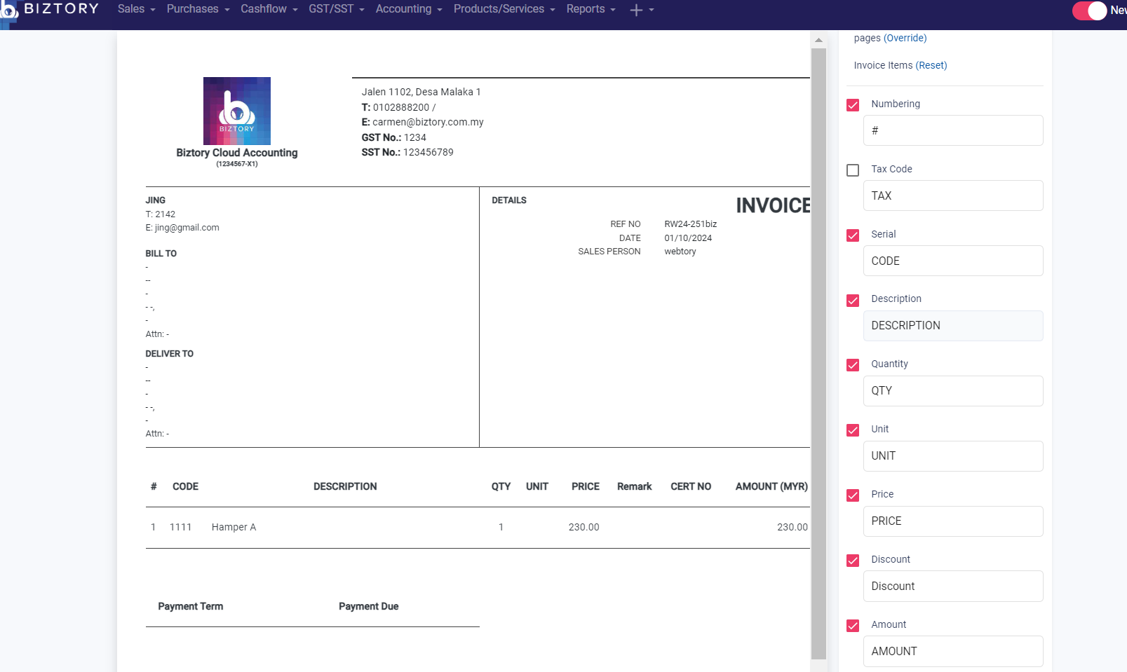4. Select the columns you wish to hide in the invoice and uncheck them.