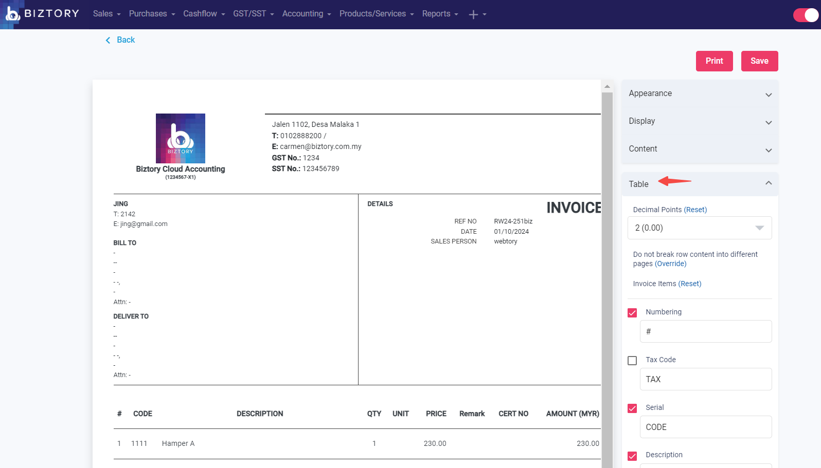 1. Go to your invoice and click the “Print"