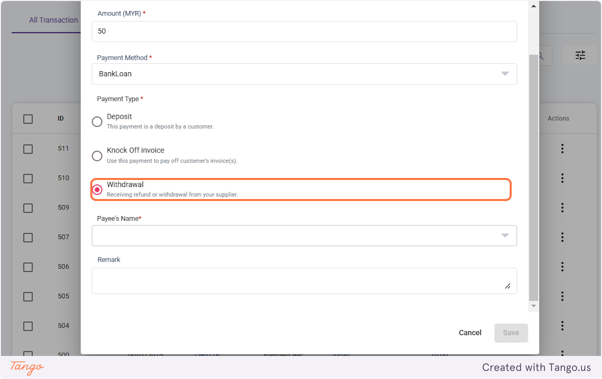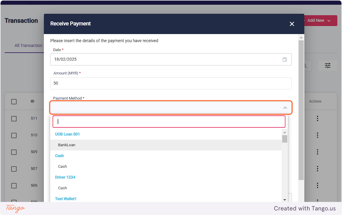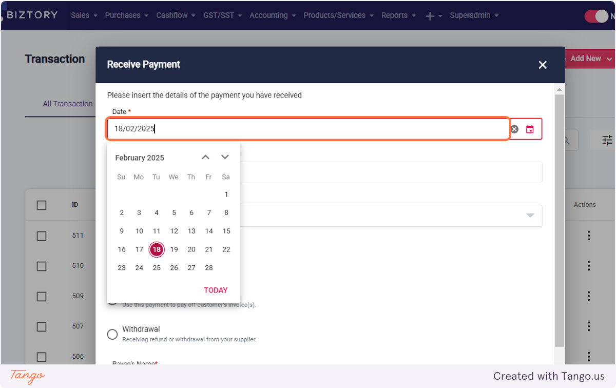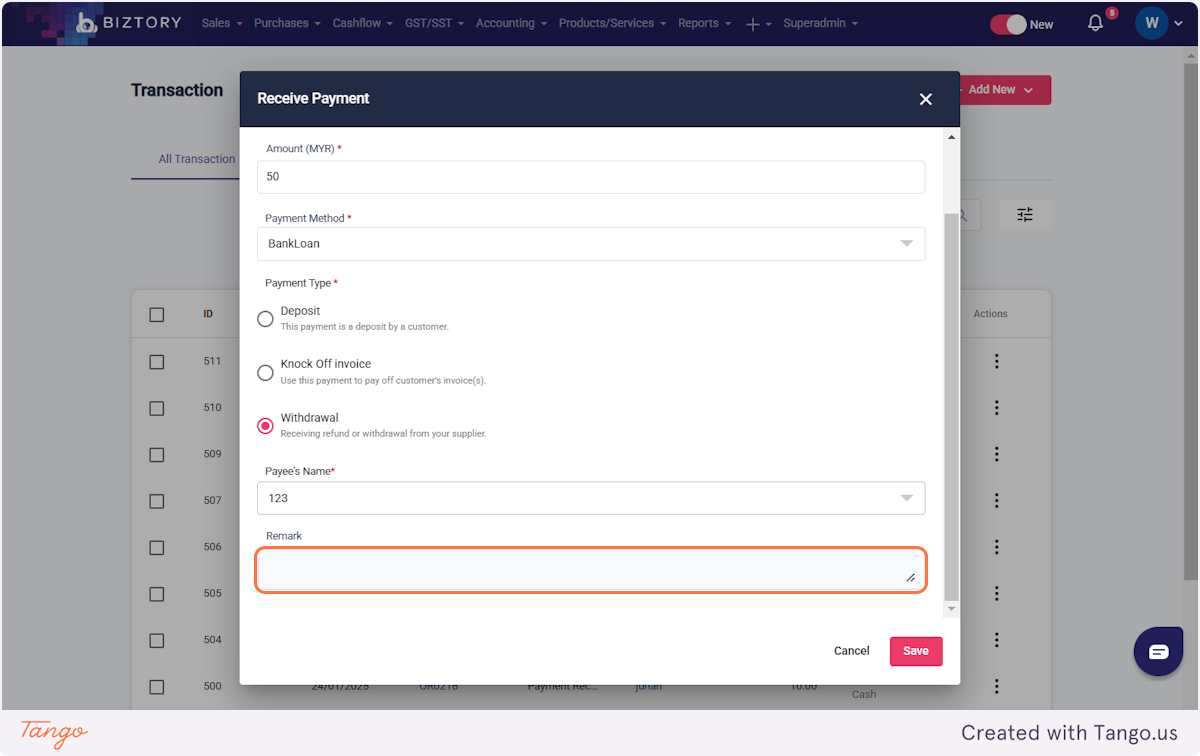 1. Click on Cashflow and select 'Transaction'