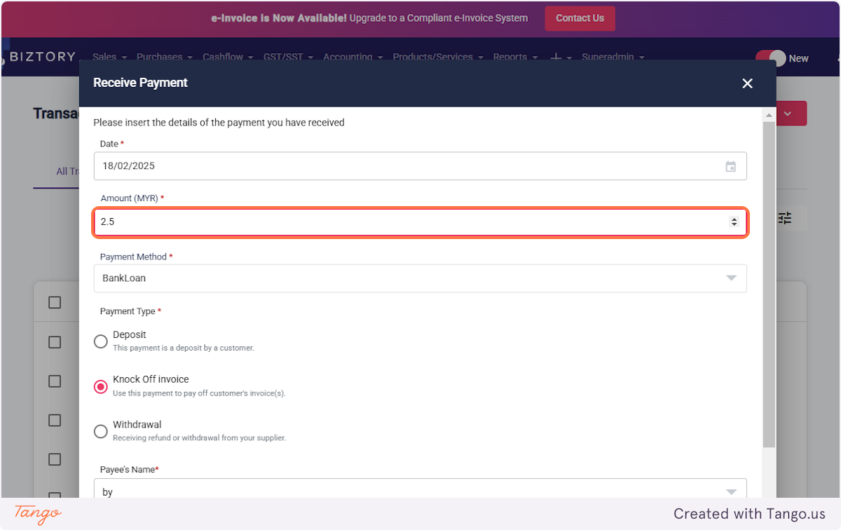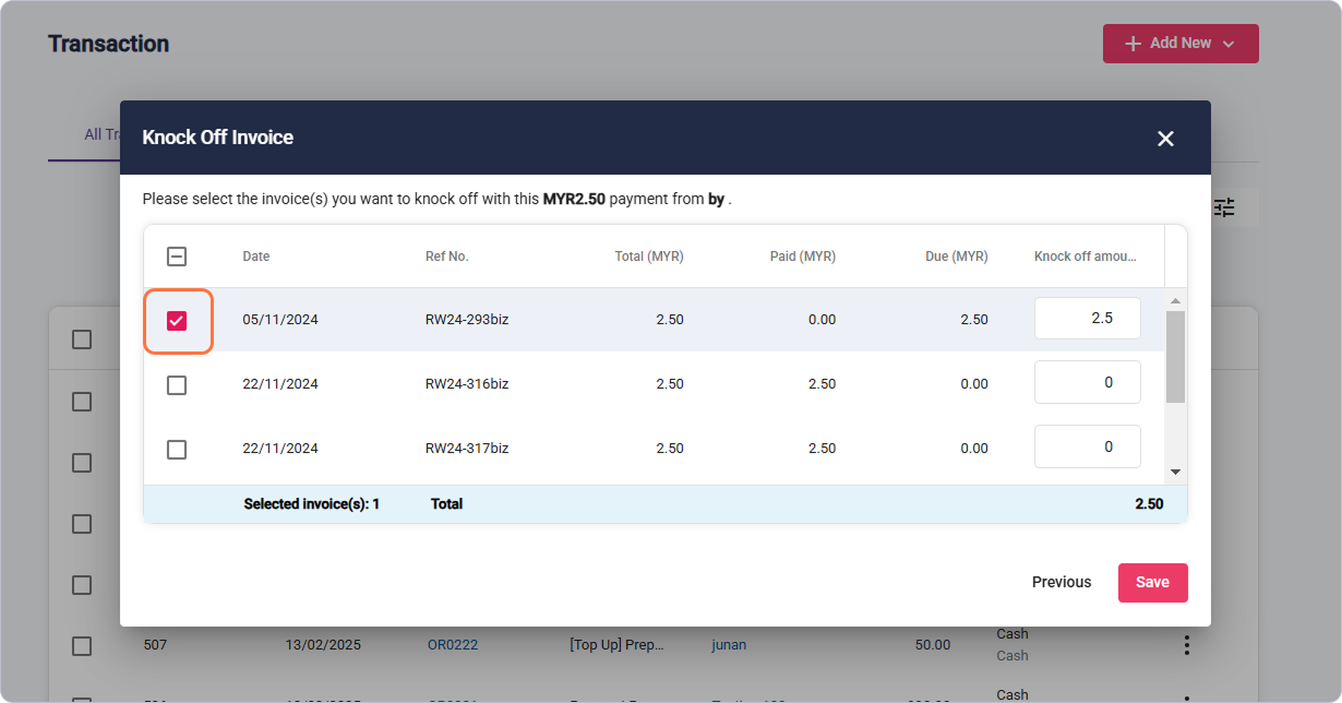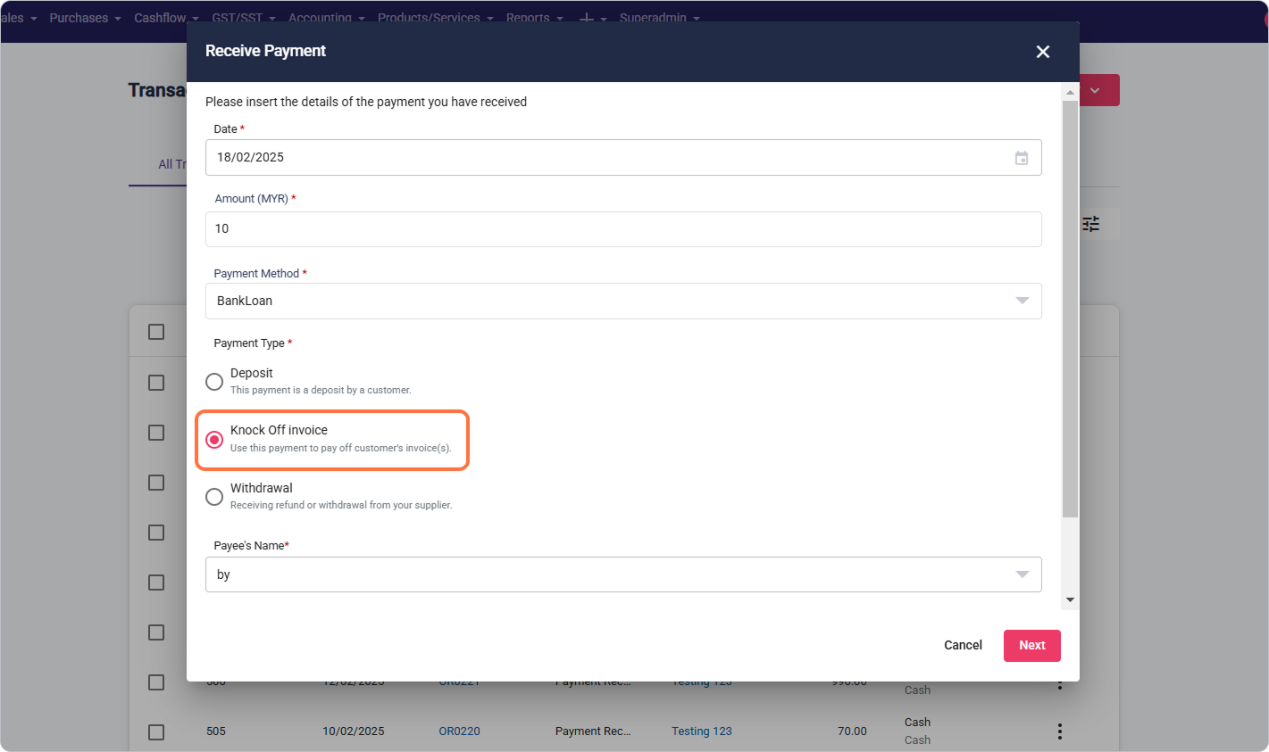 7.1 If the payment type is 'Knock Off Invoice'
