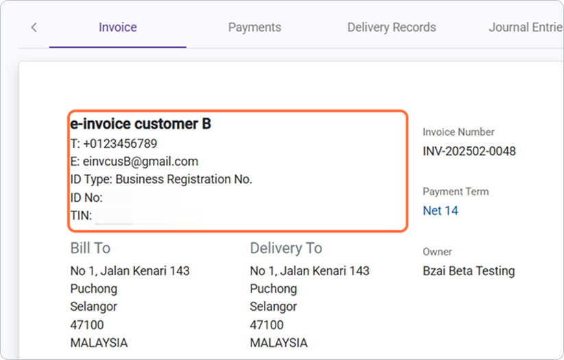 Customer and supplier e-Invoice details are essential for ensuring accurate tax reporting and compliance. When issuing an e-Invoice to a customer, key details such as the customer's business registration number (BRN), tax identification number (TIN), and invoice breakdown must be correctly recorded. Similarly, when receiving an e-Invoice from a supplier, verifying details like the supplier's BRN, invoice amount, and tax components ensures proper bookkeeping. Keeping accurate e-Invoice records helps businesses streamline tax submissions, avoid errors, and maintain compliance with regulatory requirements.