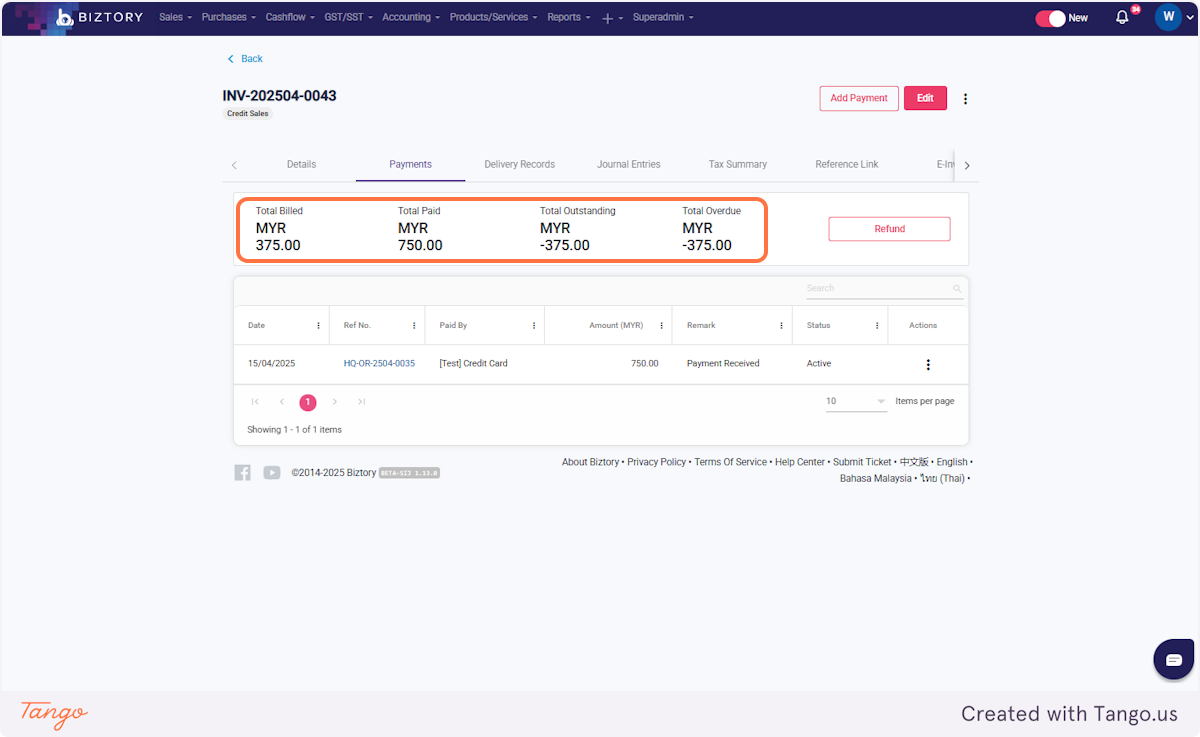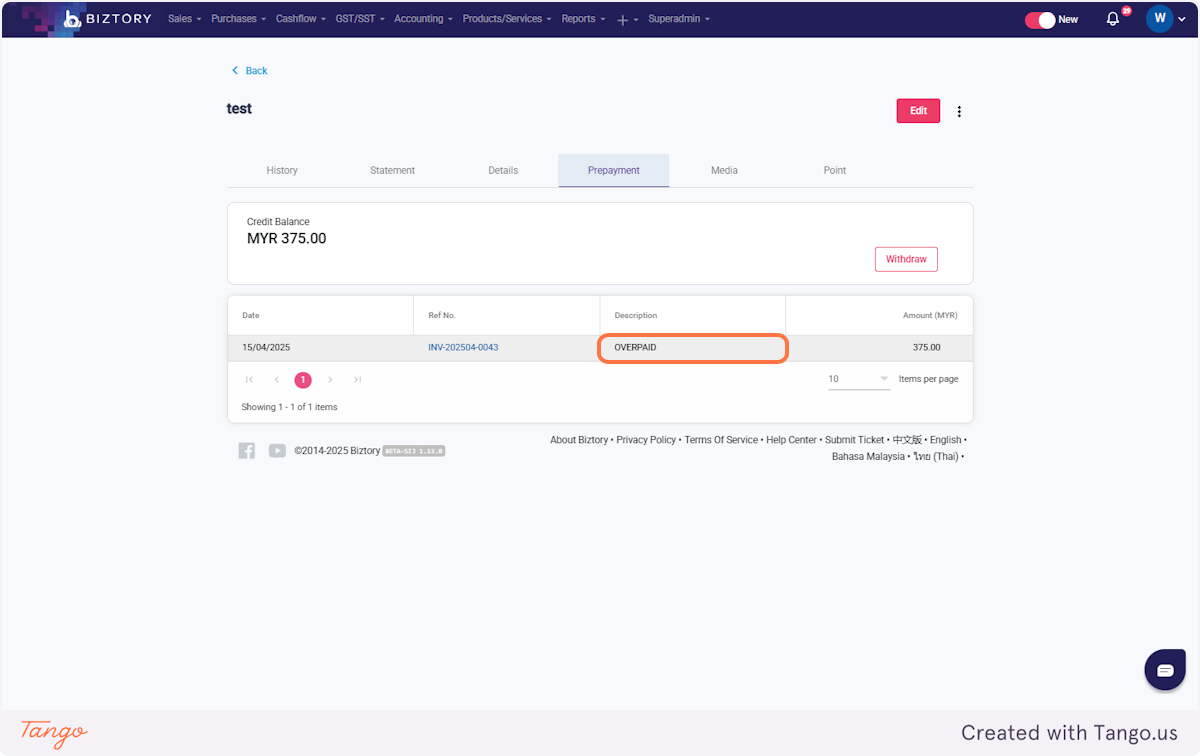 7. You issued an invoice amounting to RM375. You made a payment of RM750, resulting in an overpayment of RM375.